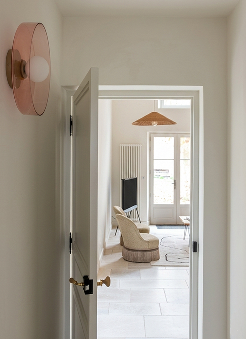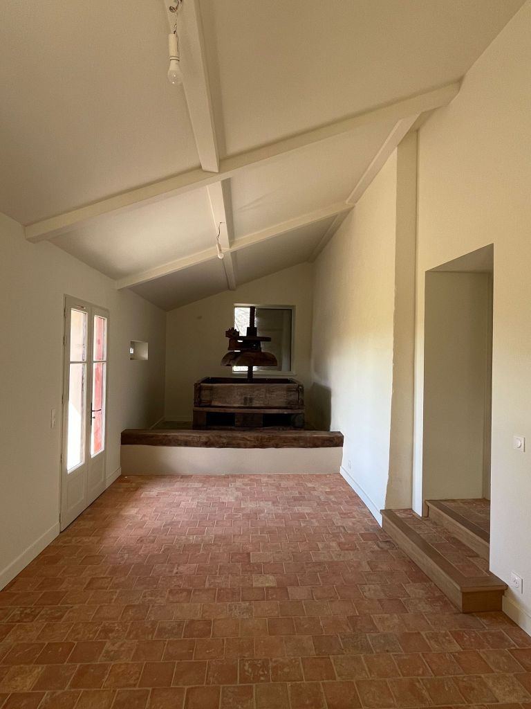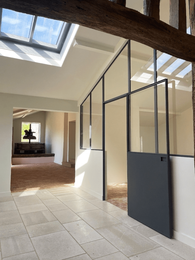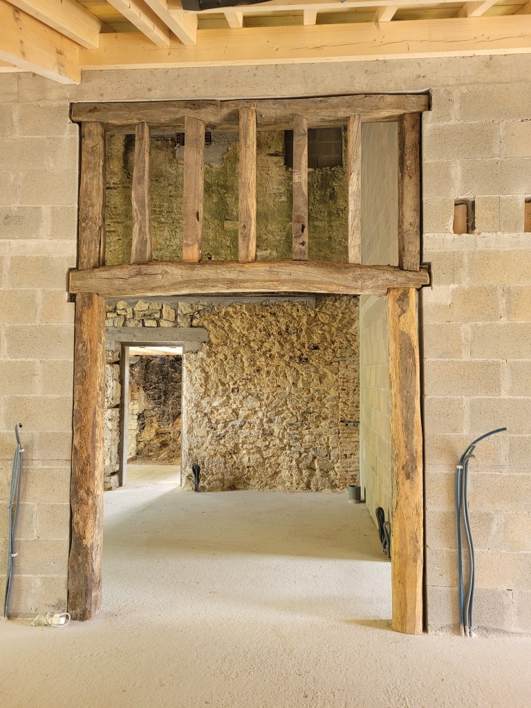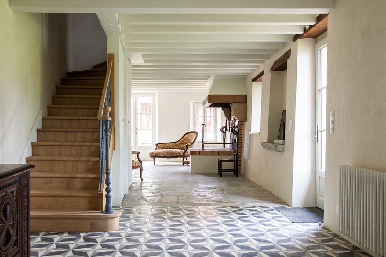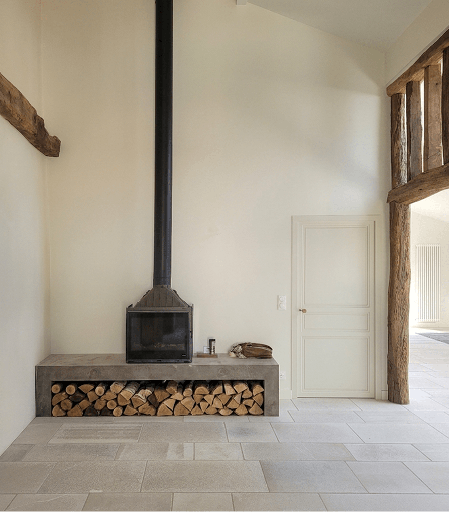 Plusieurs éléments ont été conservés et mis en valeur plutôt que remplacés. Le pressoir, témoin direct de l’histoire agricole du lieu, a été intégré dans l’une des pièces de la ferme — non comme objet muséal, mais comme élément à part entière de l’espace habité. La charpente existante a été réemployée pour constituer un pan de bois structurel, aujourd’hui élément de passage entre les deux salons : un geste qui relie l’histoire du bâtiment à ses nouveaux usages. Le sol en tommettes, matériau traditionnel du territoire, assure quant à lui une continuité matérielle dans l’ensemble de la ferme.