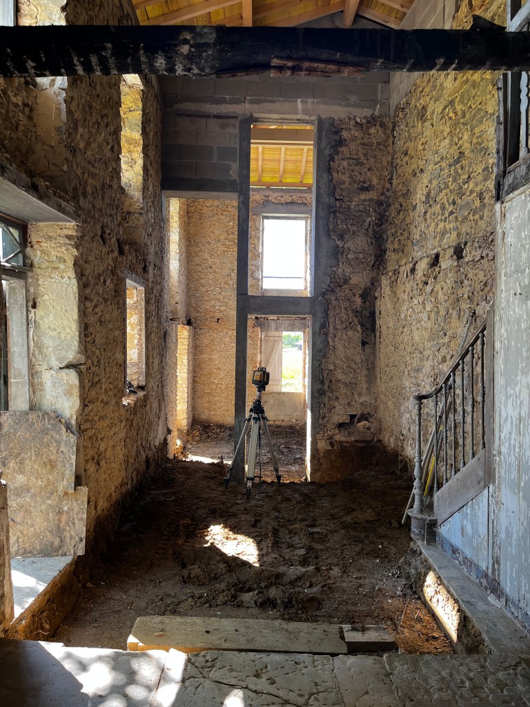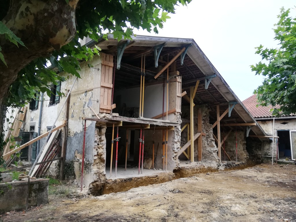 CHANTIER_Refection des enduits à la chaux façade Nord OuestCHANTIER_Dépose des planchers pour réalisation des solsCHANTIER_Réemploi in situ du bois de charpenteCHANTIER_Réemploi in situ du bois de charpenteCHANTIER_Démolition de la façade Est